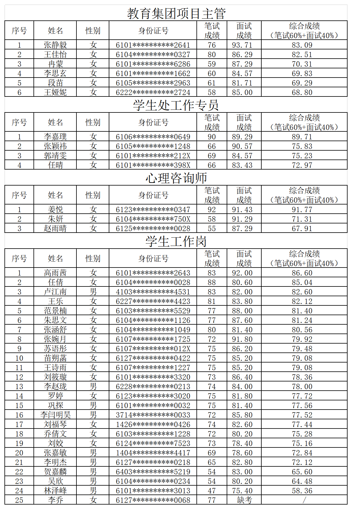 根据我校2026年编制外B类工作人员公开招聘工作安排,现将笔试面试及综合成绩进行公布(成绩附后)。